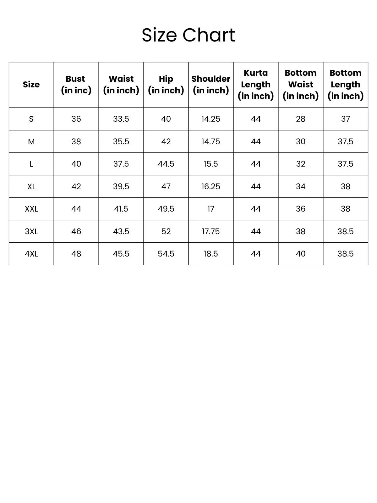 Size | Bust | Waist | Hip | Shoulder | Kurta Length | Bottom Waist | Bottom Length |